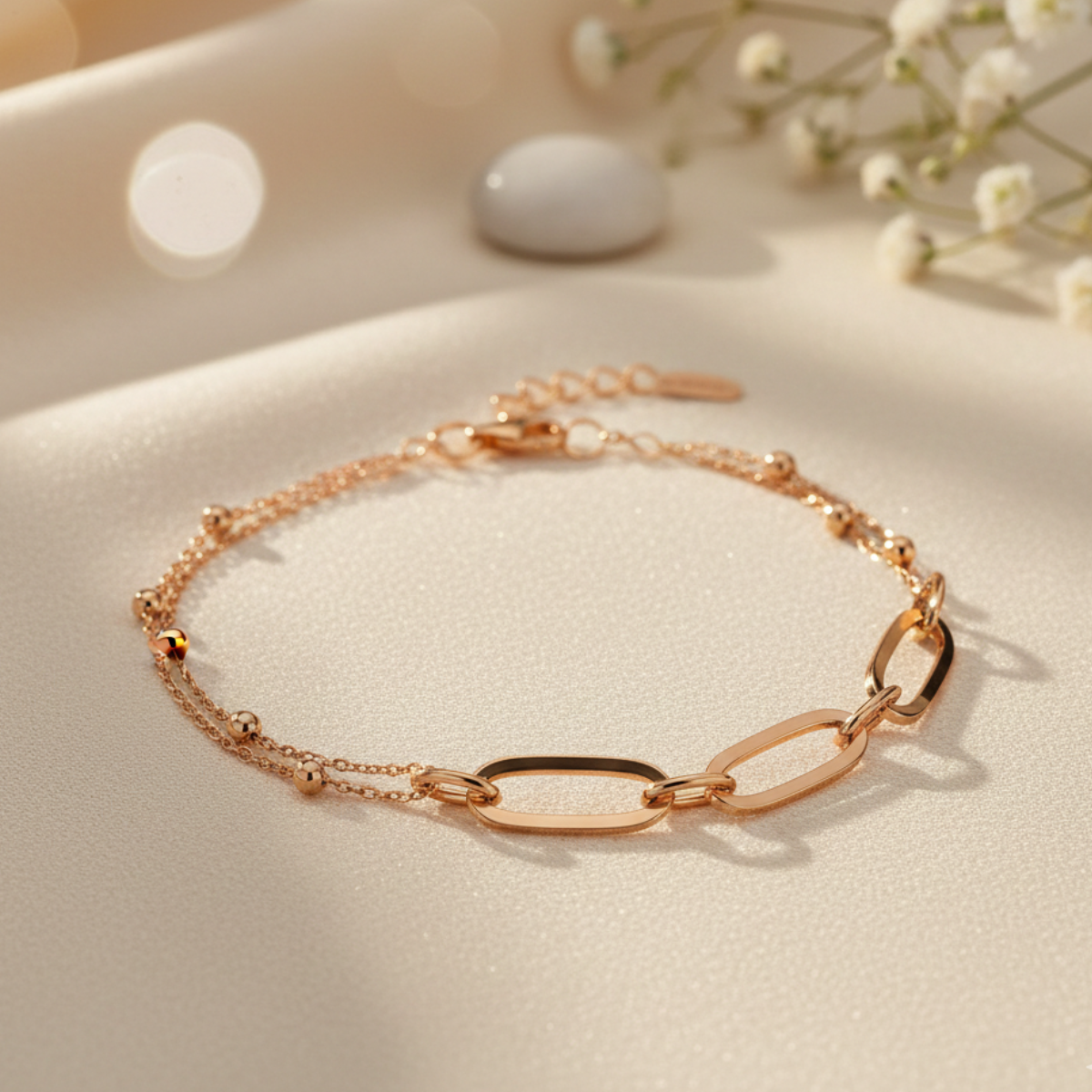 - Wyjątkowy wzór: Bransoletka łączy nowoczesność z tradycją, składając się z delikatnego łańcuszka z kuleczkami oraz modnych, grubych ogniw.