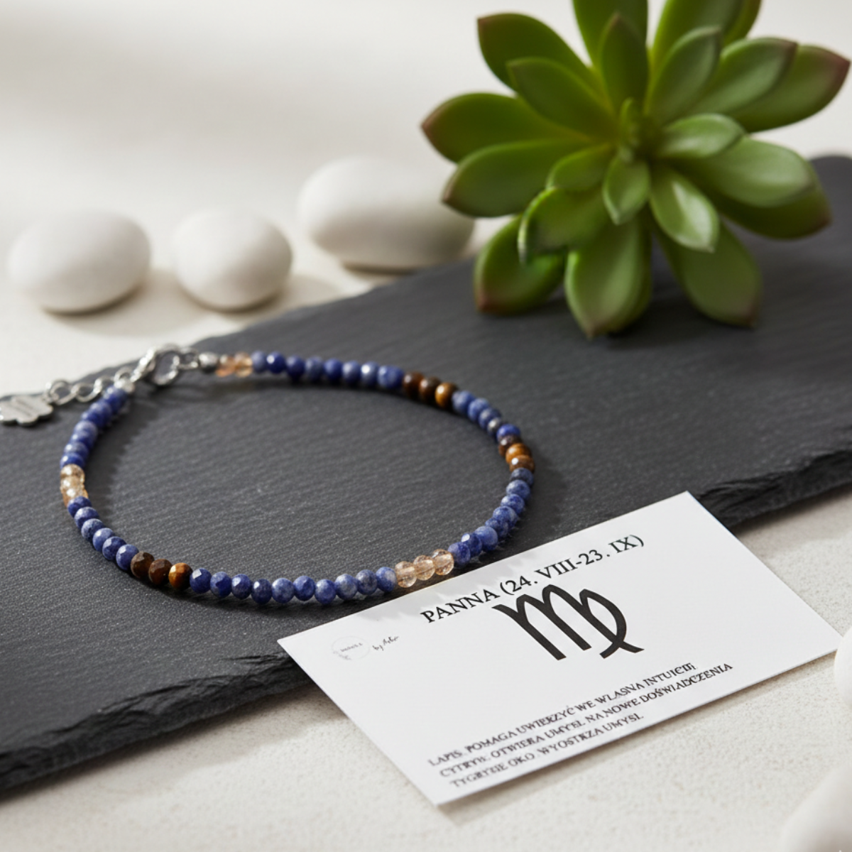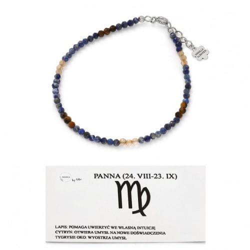 Zaprezentowana bransoletka to uszlachetnienie dla urodzonych w znaku Panny, które słyną z perfekcyjnego organizowania oraz analitycznego umysłu. Lapis lazuli zachęca do zaufania swojej intuicji, cytryn rozwija otwartość na nowe idee, a tygrysie oko wyostrzy percepcję intelektualną, dokładnie jak Panna, która zawsze dąży do doskonałości.