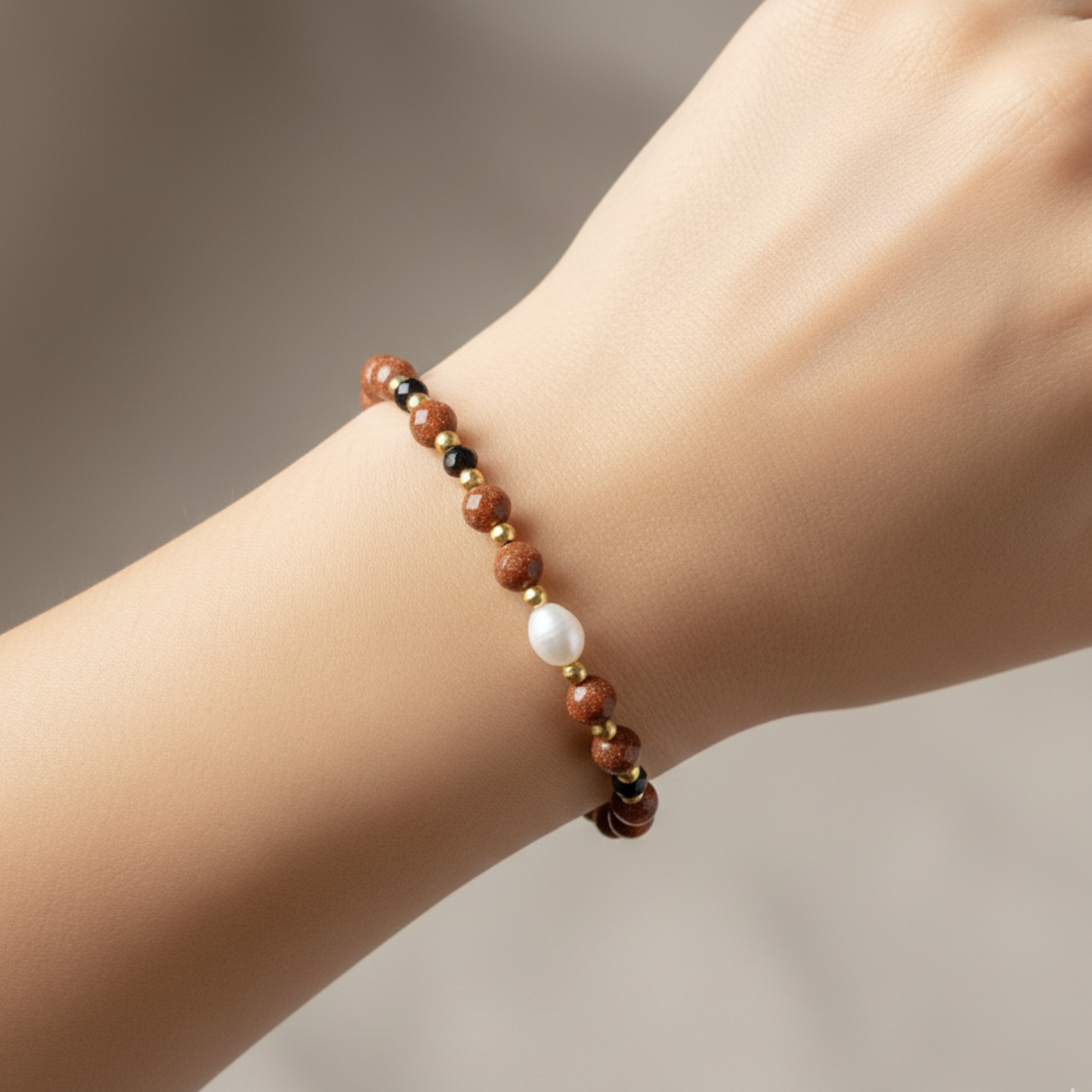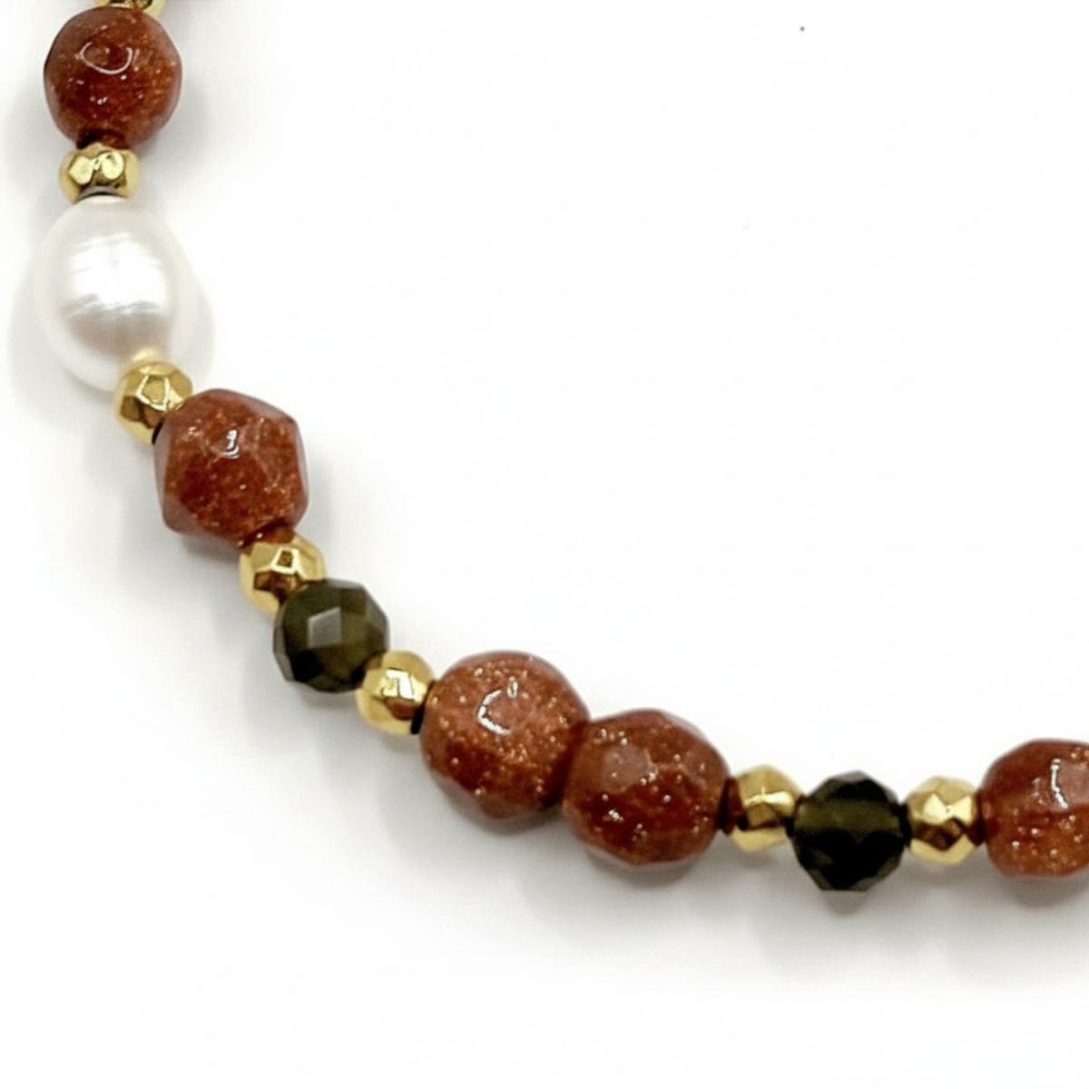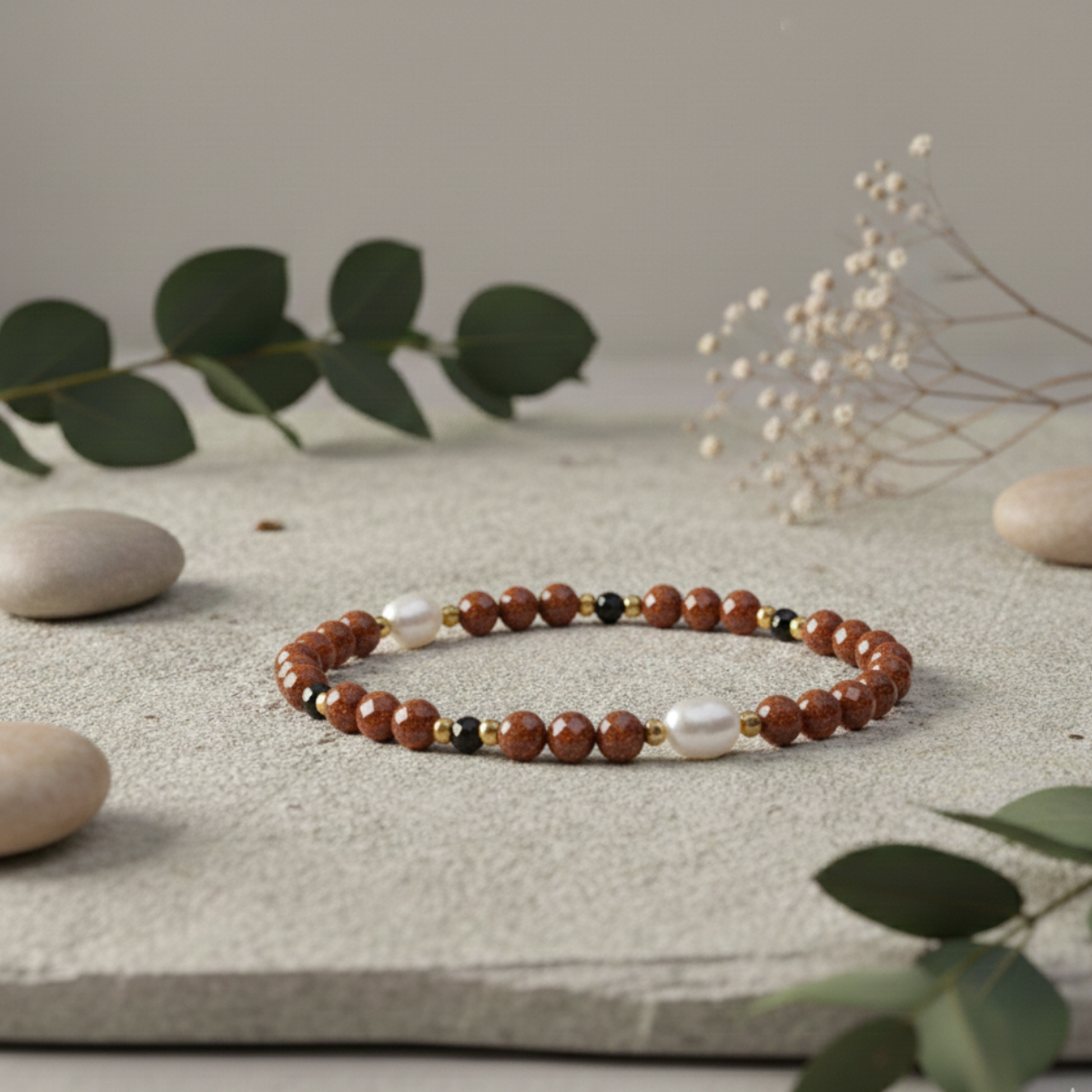 • Kamienie: Ekskluzywny i rzadki piasek pustyni, połączony ze świecącym spinelem, elegancką perłą i matowym hematytem.