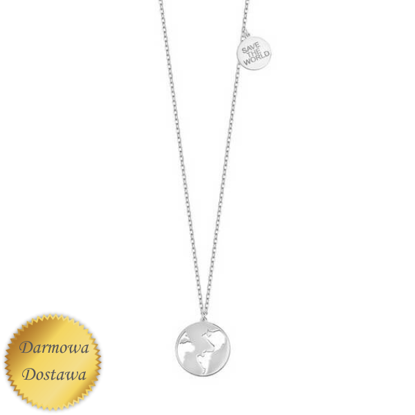 Naszyjnik wykonany z najwyższej próby srebra 925, pokryty warstwą rodu z globem i subtelnym kółeczkiem z napisem "save the world".