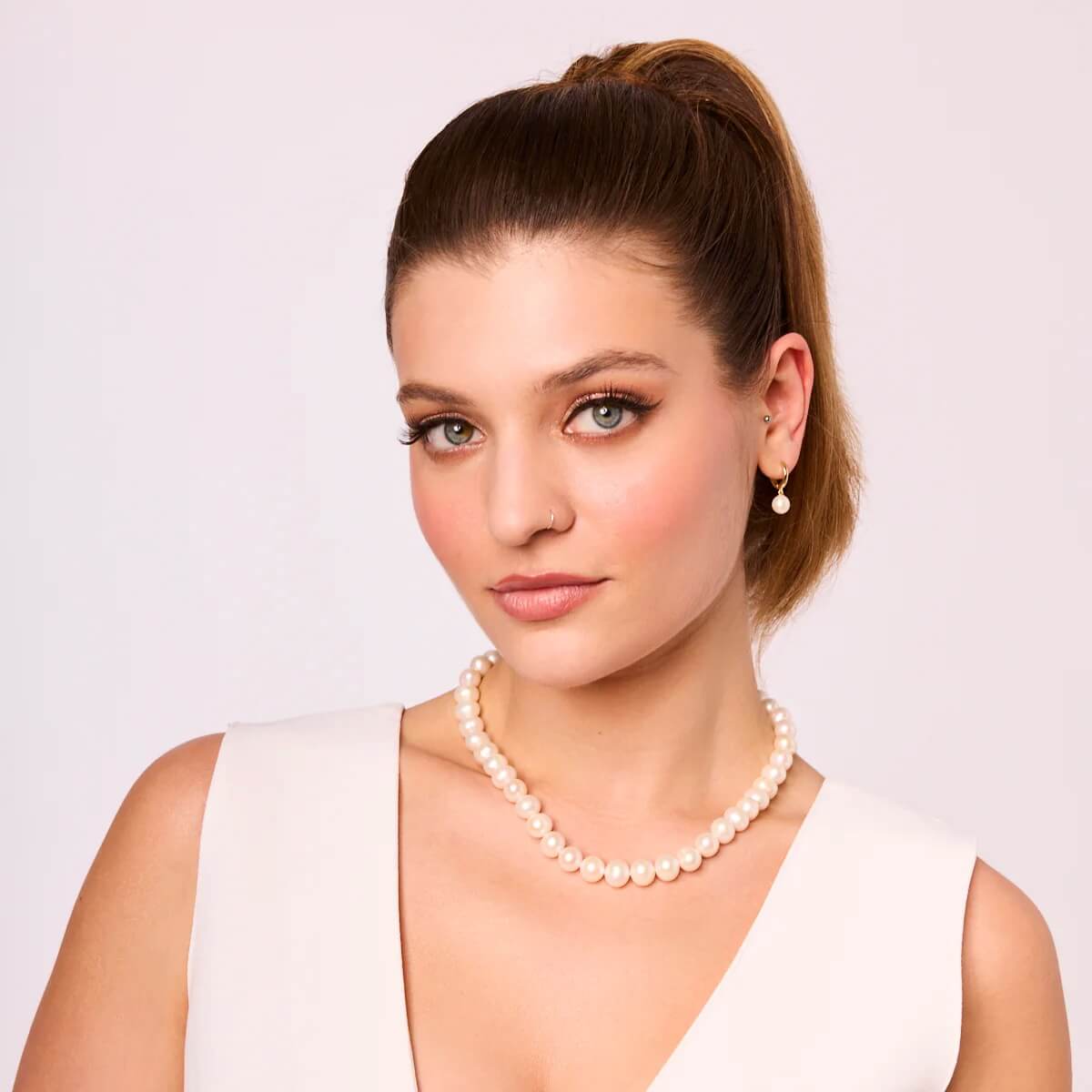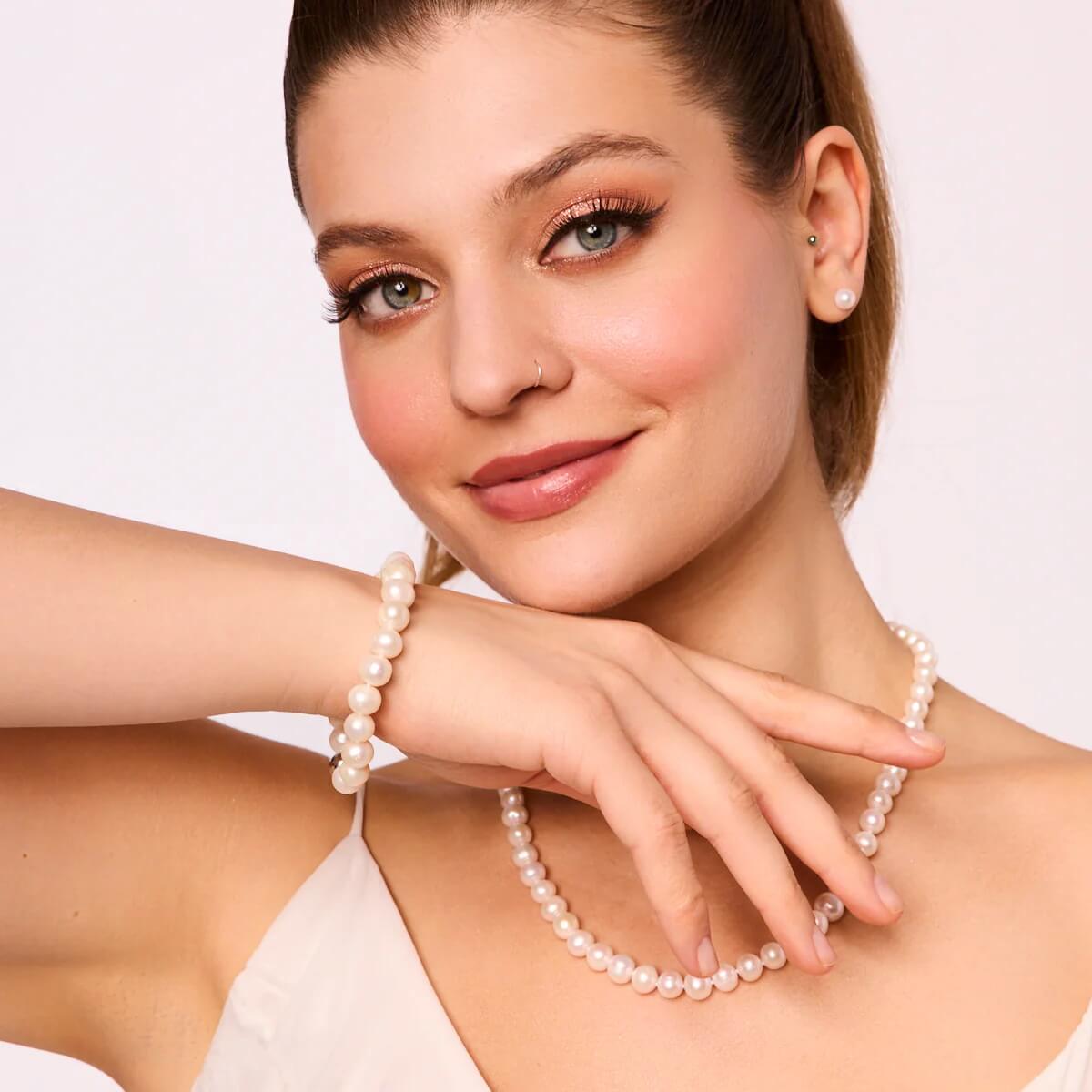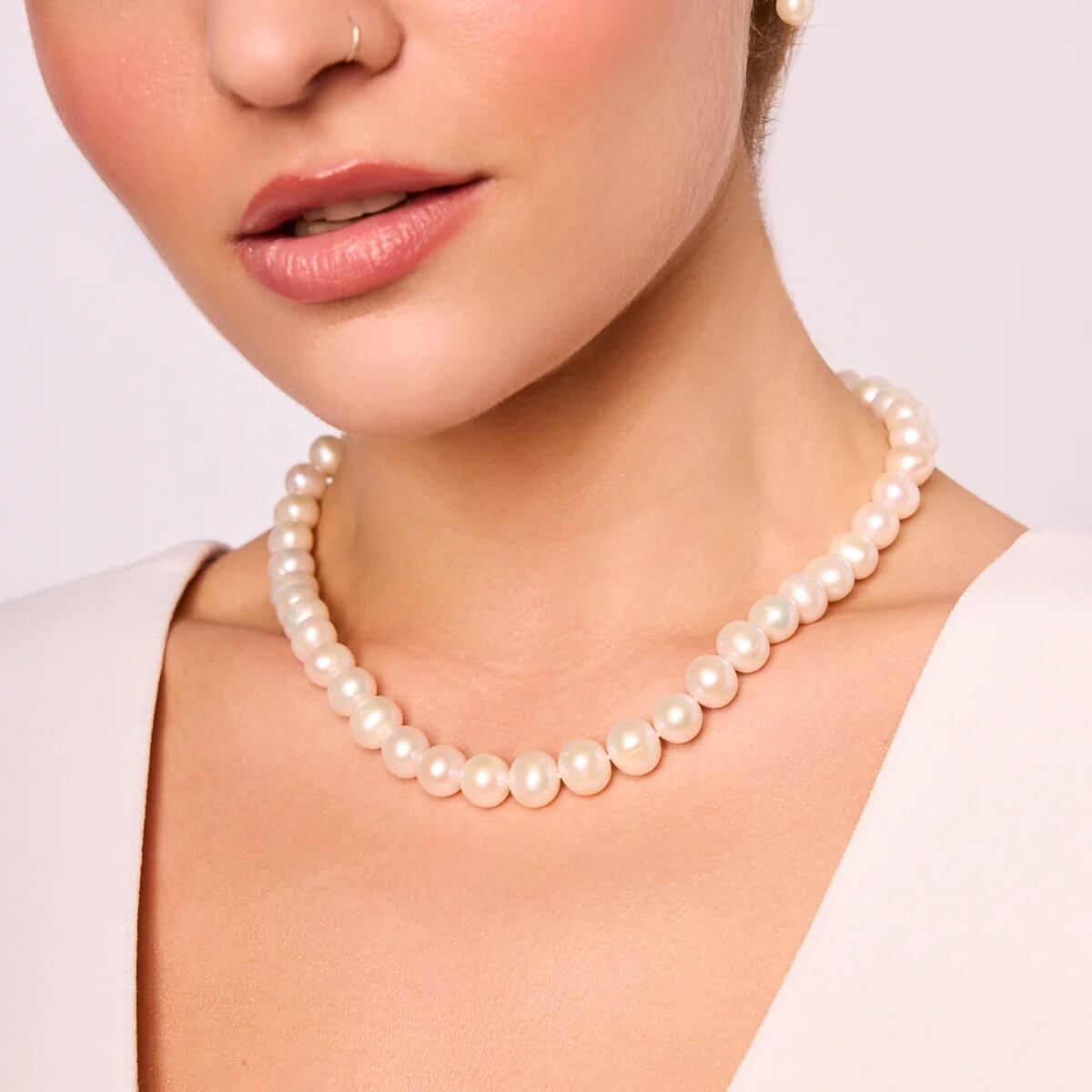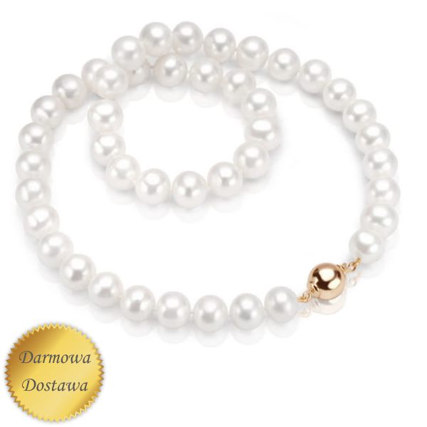 Naszyjnik z naturalnych pereł słodkowodnych o długości 45 cm w kolorze szlachetnej bieli o jakości A. Naszyjnik z zapięciem w złocie próby 585. Średnica pereł wynosi 10 - 11 mm. Waga naszyjnika 55 g.